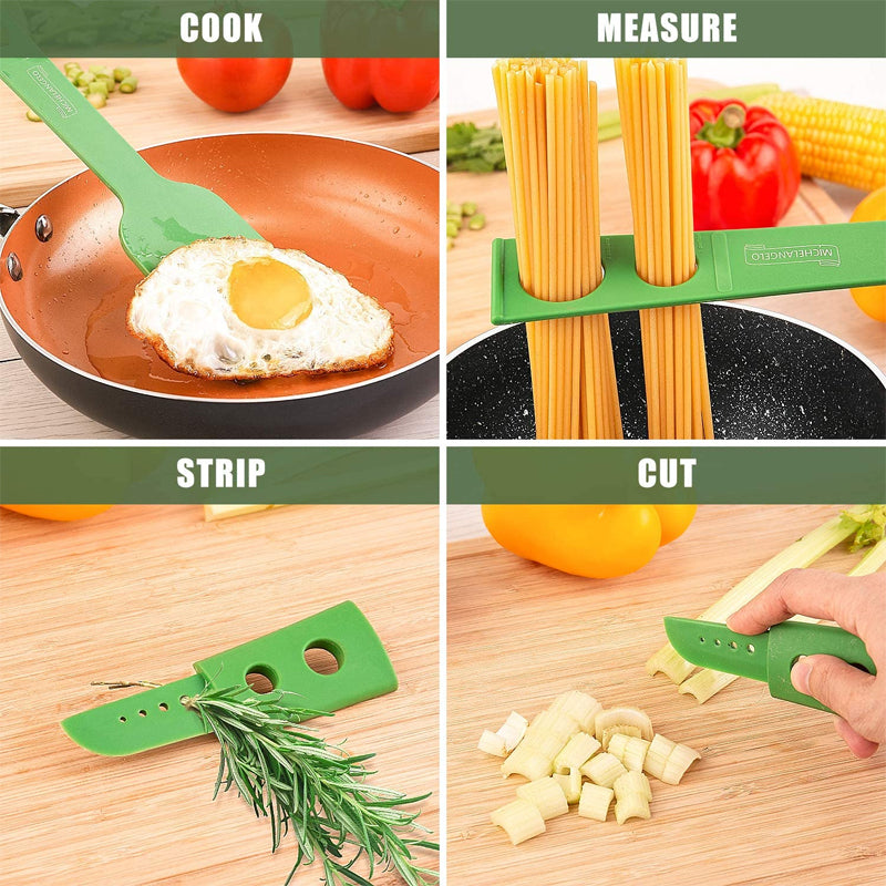 - COVER ALL THE KITCHEN NEEDS – These durable cooking gadget covers all your kitchen needs from cutting vegetables, preparing food for cooking, to serving. Set includes: 1 cutting knifae/Striper, 1 Strainer/Server/Egg Separator/Masher, 1 Spatula/Measurement.