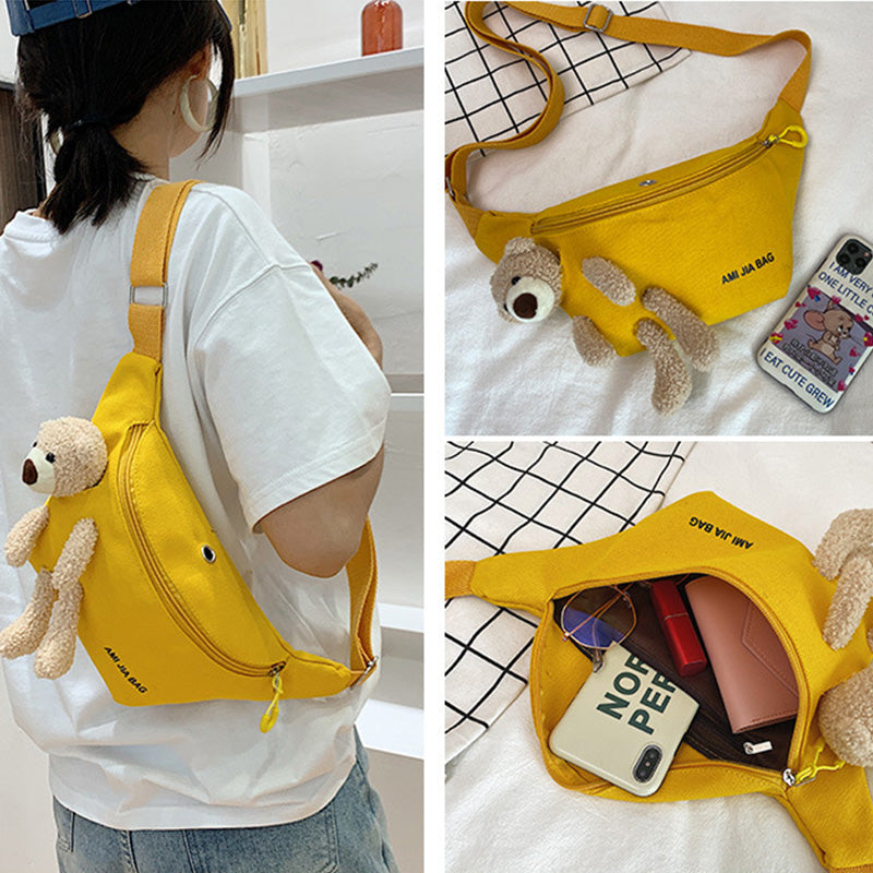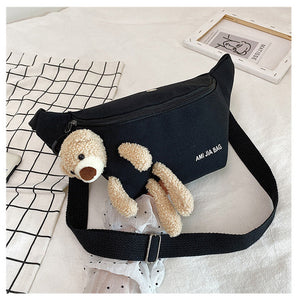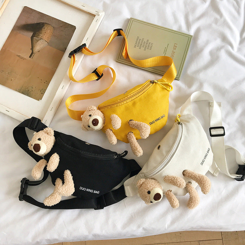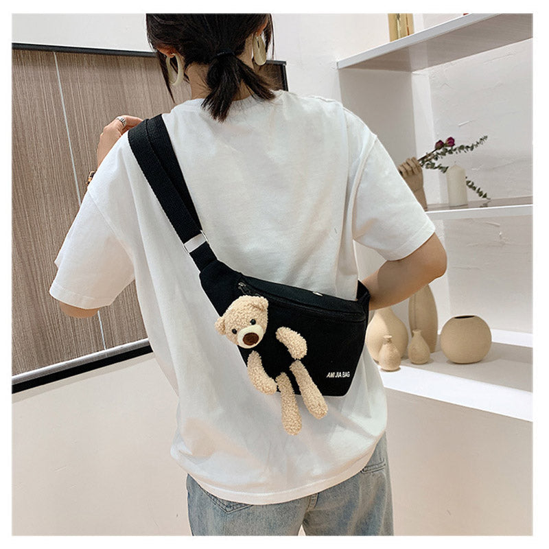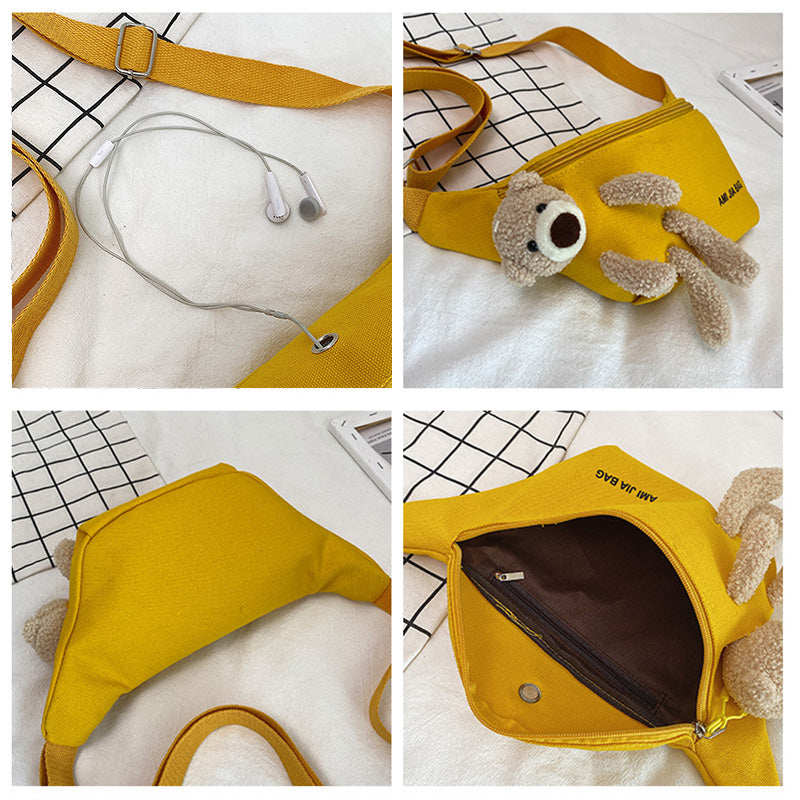 Material: The Cartoon Bear Shoulder Bag is made of polyester fiber and has an opening for the earphone hole. It is very convenient to listen to music. The shoulder bag size of the cartoon bear is 11 * 5.9 * 2inches.