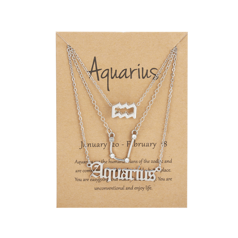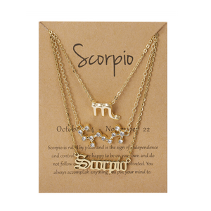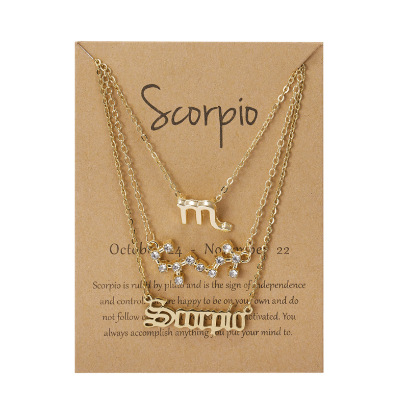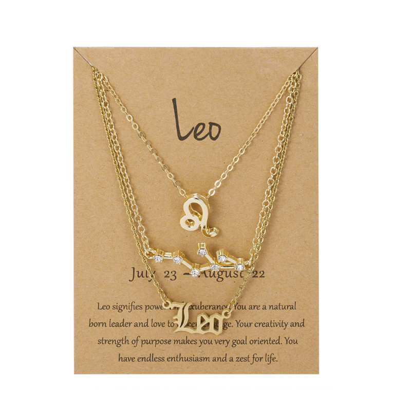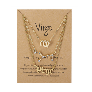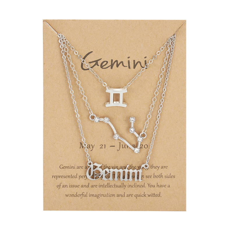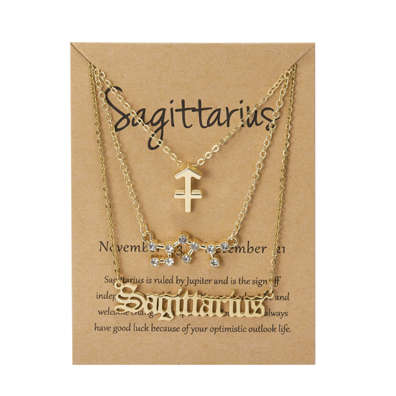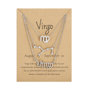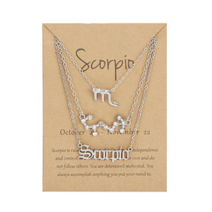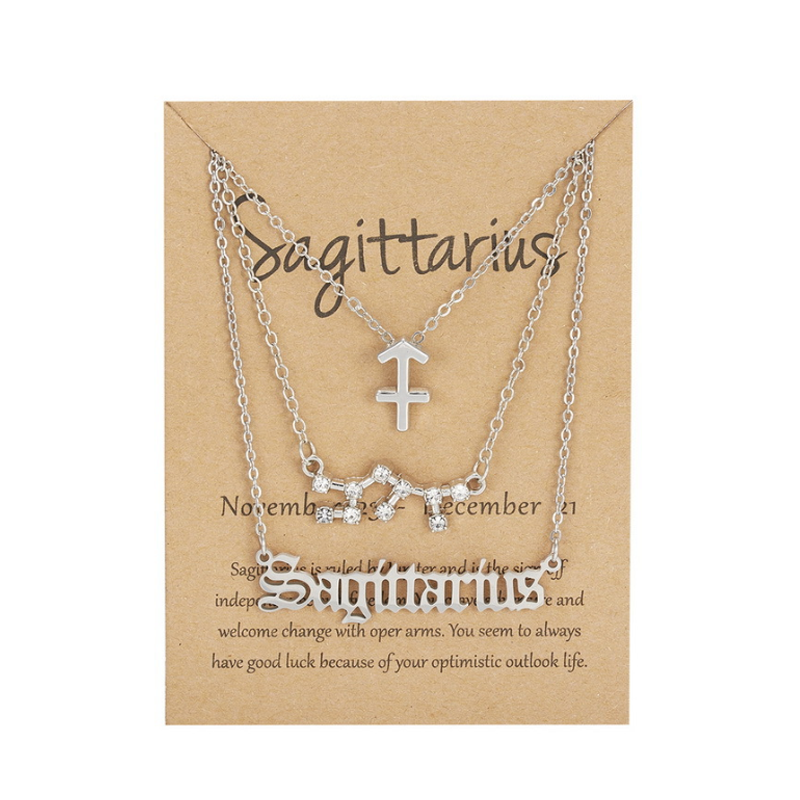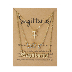 Packing list: 3 constellation necklaces in different styles. (3 colors-gold / silver / rose gold.). 1 * gift box. 1 kraft paper card (description of the special characteristics of the corresponding constellation). 1 * gift bag.