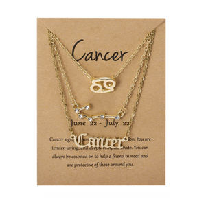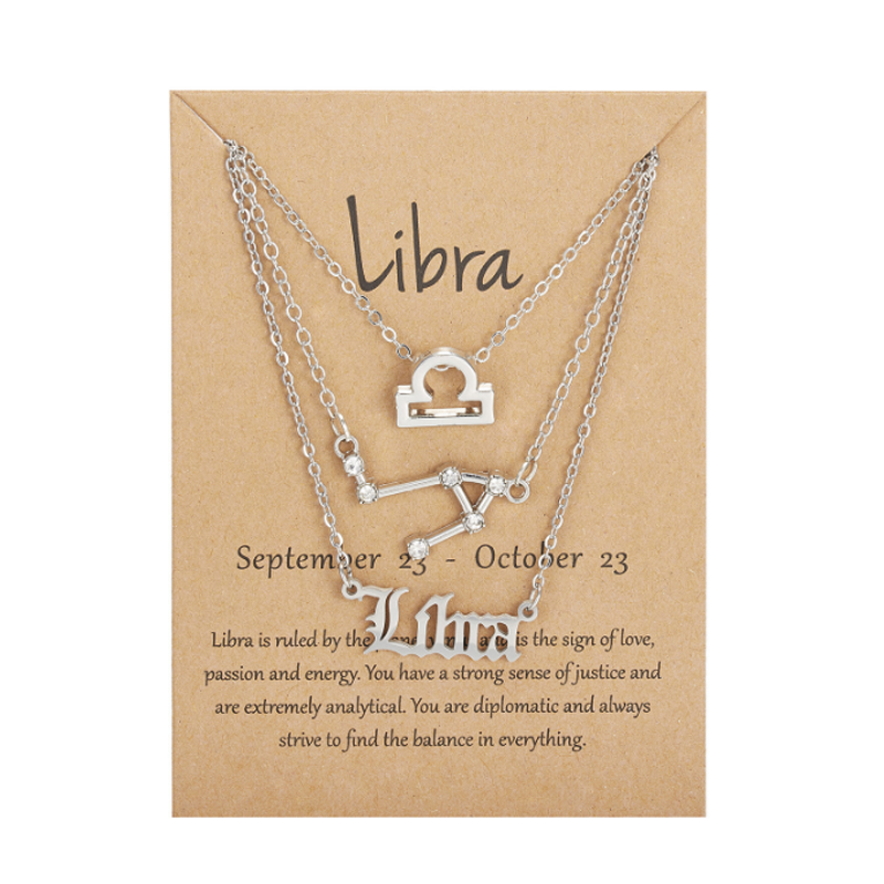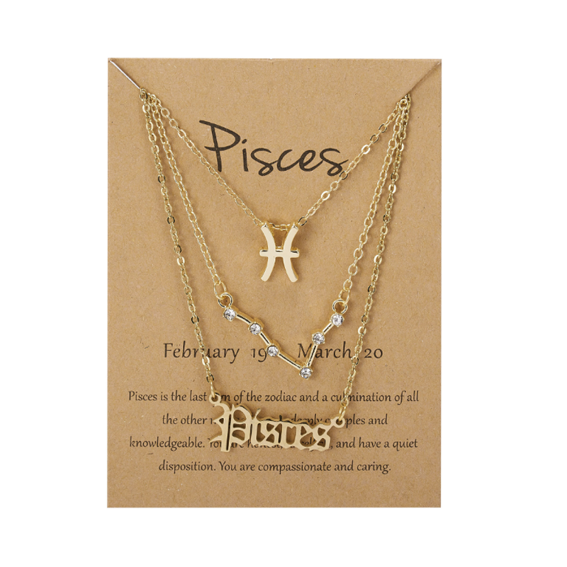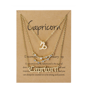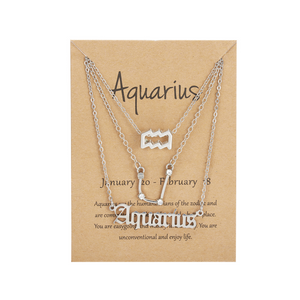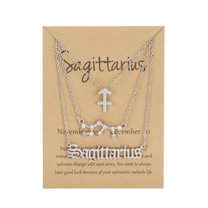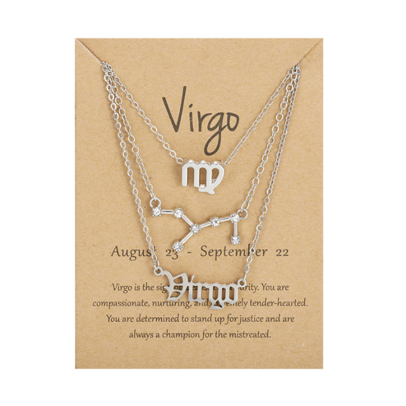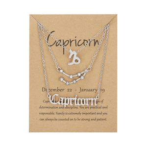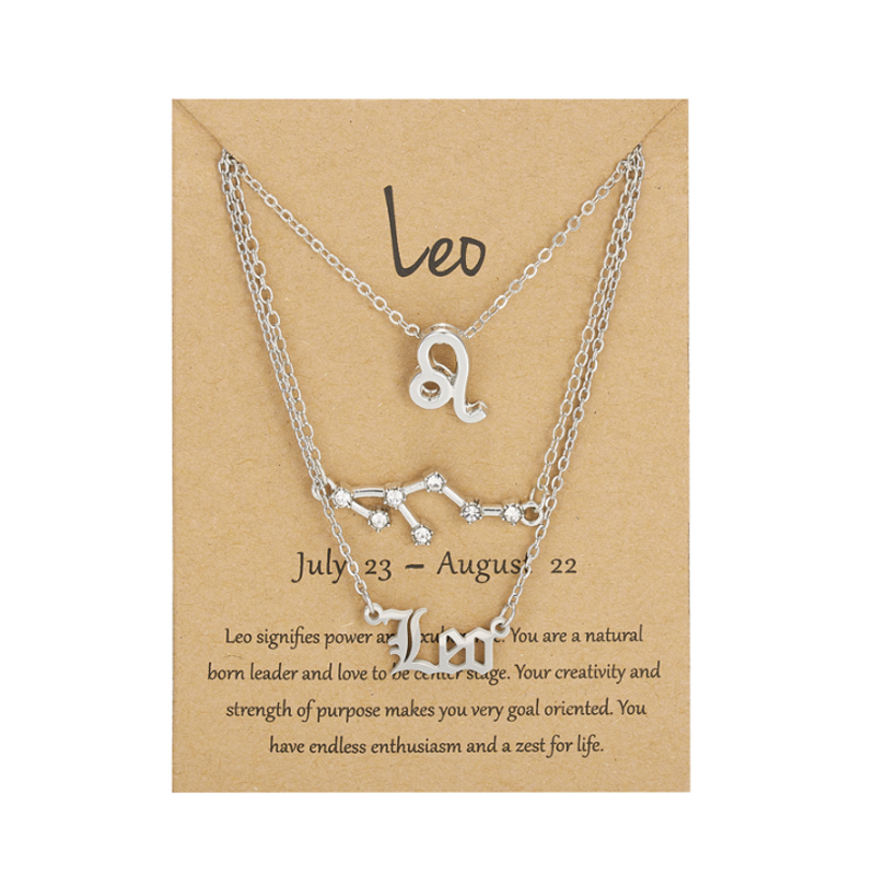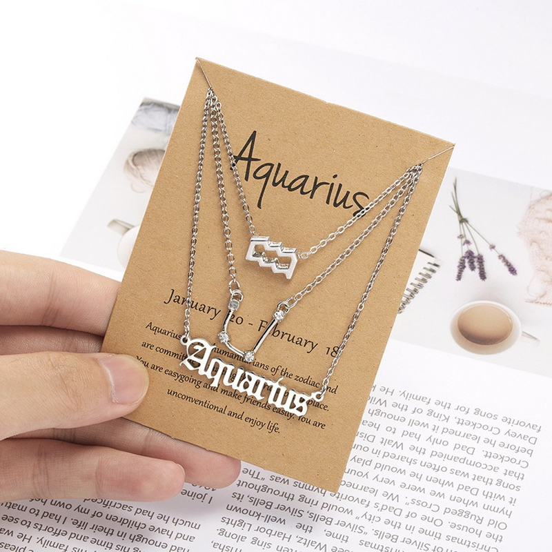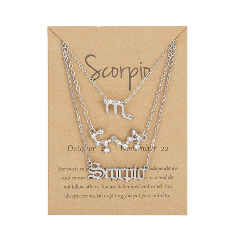 Packing list: 3 constellation necklaces in different styles. (3 colors-gold / silver / rose gold.). 1 * gift box. 1 kraft paper card (description of the special characteristics of the corresponding constellation). 1 * gift bag.