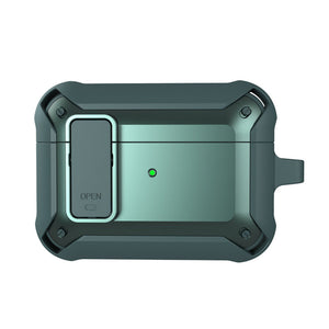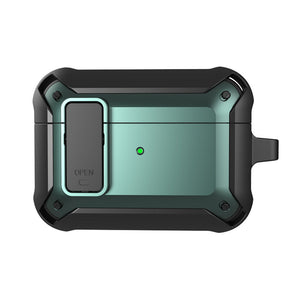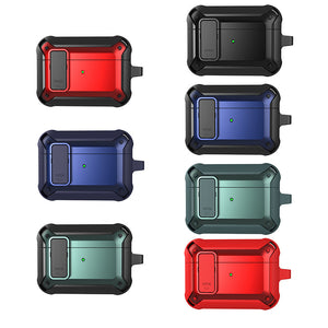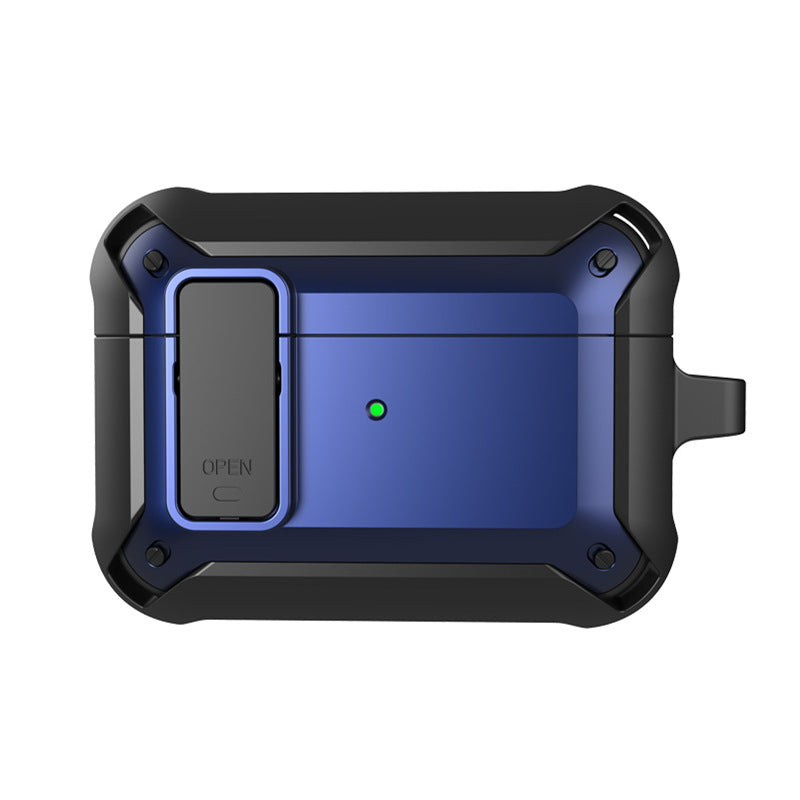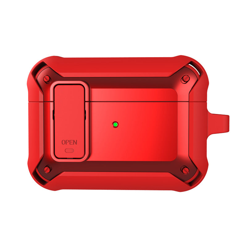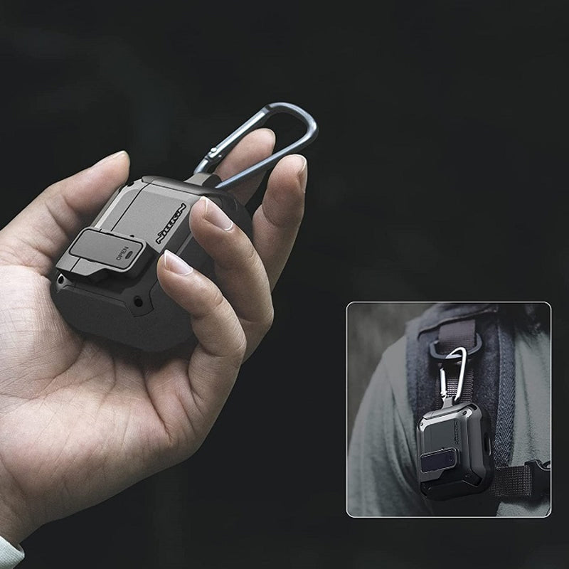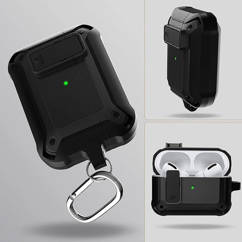 Security Lock: The locking feature holds the cover of the housing securely in place and opens the top cover with one touch. The Air Pods housing also comes with a portable carabiner that can be easily attached to your bag, belt loop, or keys ...... Convenient for you to use.