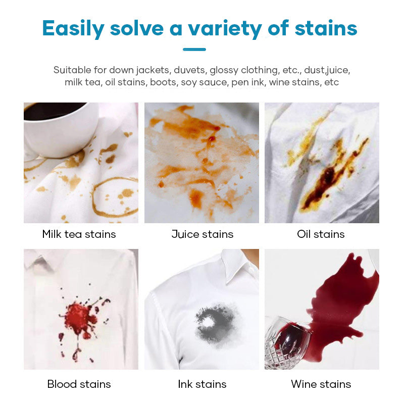 1. Effectively remove all kinds of stains: It can be used for food stains, cosmetic stains, beverages (coffee, tea, wine, cola, etc.), ketchup, oil stains, etc. It is practical and easy to use.