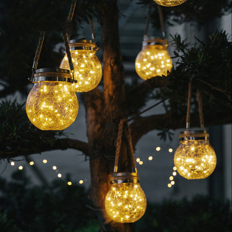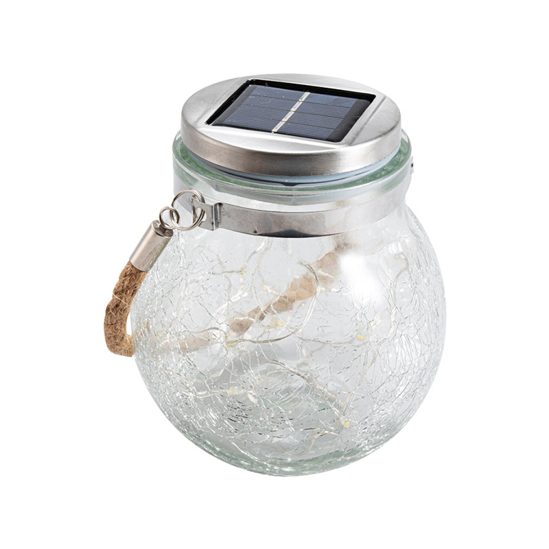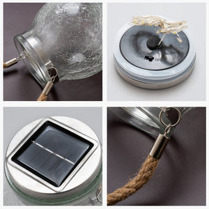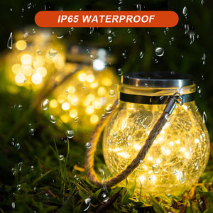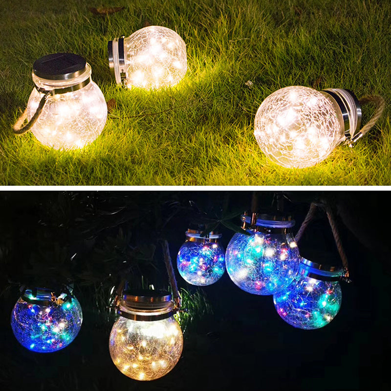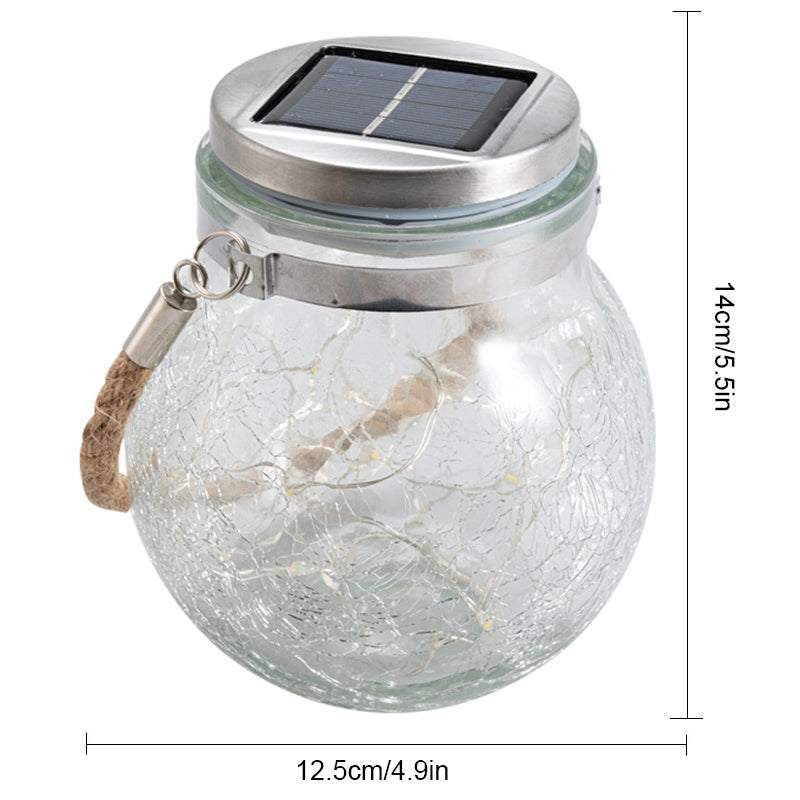 Upgrade 30 LED Bulbs Crack Glass Jar Hanging Solar Lights - 3 meters long string lights with 30 LED bulbs is more brighter than other 20 LED bulbs.It’s more beautiful and bright in every occasion.The built-in battery is1.2V 600MAH,crack glass jar dimension: 4.9" Dia. x 5.5"H