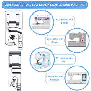 For use with low-shank sewing machines, including brands Babylock, Bernina, Brother, Elna, Euro-Pro, Husqvarna Viking, Janome, Juki, Kenmore, Necchi, New Home, Pfaff, Simplicity, White.