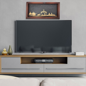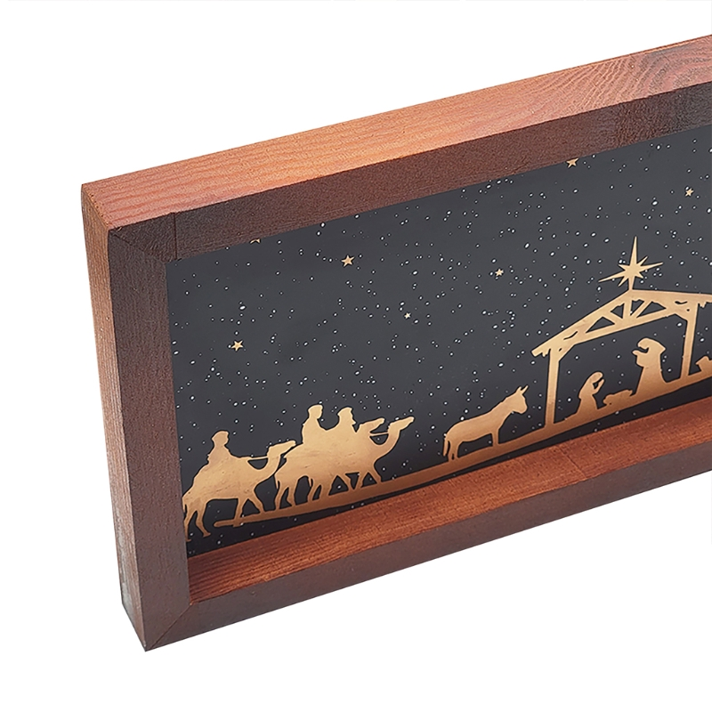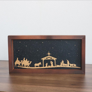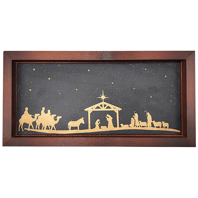 The background on this sign is black, with a stained nativity scene and stained scattered stars.