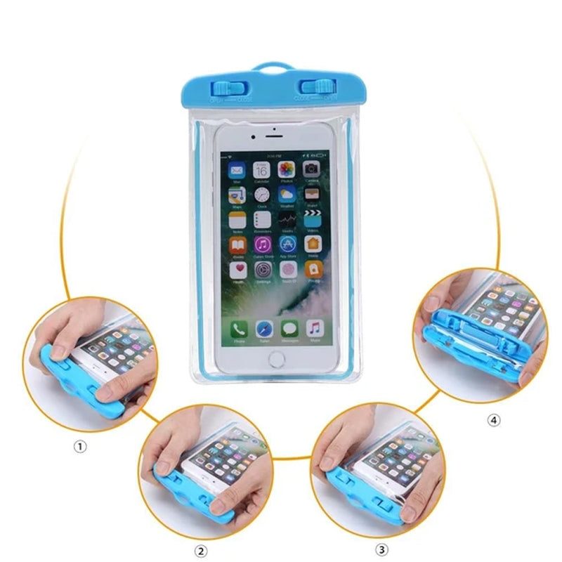 Secure Lock & Fluorescent Strip: The underwater bag is simple to open and close the pouch by turning the two switches on the top. The strips on both side glow in the dark that prevents you from losing your case. Ensure excellent protection for your devices.