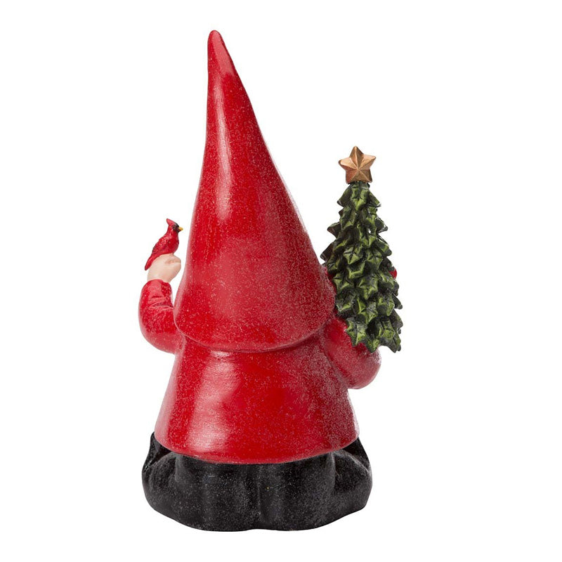 SANTA-INSPIRED GNOME STATUE: Wears a red suit and black boots. White beard reaches the ground, Holds a Christmas tree in one hand, a cardinal in the other Cast in weather-resistant resin for indoor or outdoor display. A fun and thoughtful gift.
