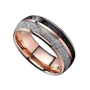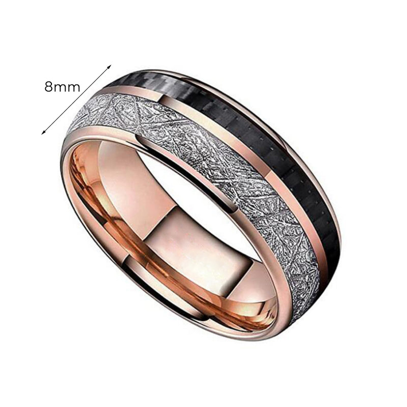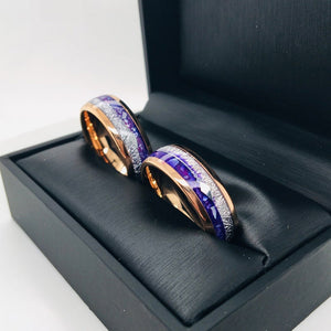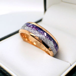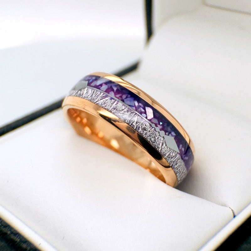 Shiny rose gold tungsten provides a beautiful backdrop for the carefully inlaid purple agate stone and meteorite. The combination of organic elements represents compassion, love and peace.