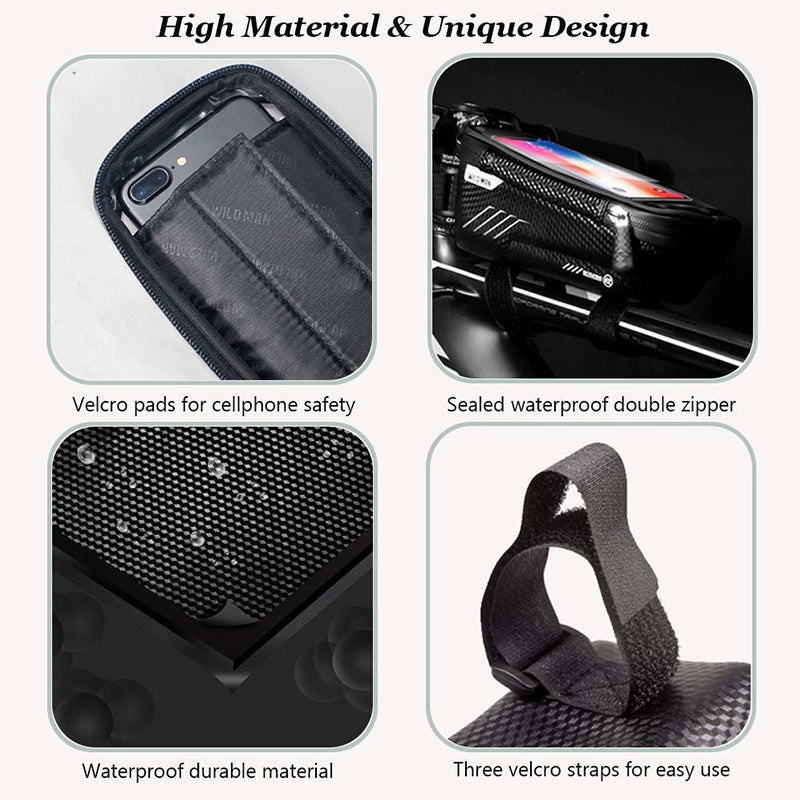★LARGE CAPACITY: This bike bag has enough space inside that holds your essentials like your phone, power bank, small tire pump, keys, wallets, first aid kit, etc. It is perfectly compatible with cellphones below 5.7inches.